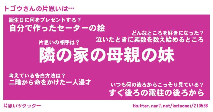 | 男性向けラノベタイトル風あだ名 | 『トゴウの憂鬱』 |