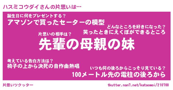 | ツイッター | ハスミコウダイさんのツイッターID『katatsumuri_man』 |