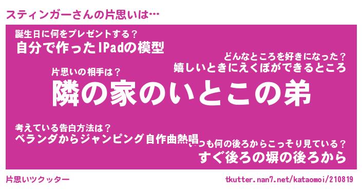 | 男性向けラノベタイトル風あだ名 | 『スティンガーの憂鬱』 |