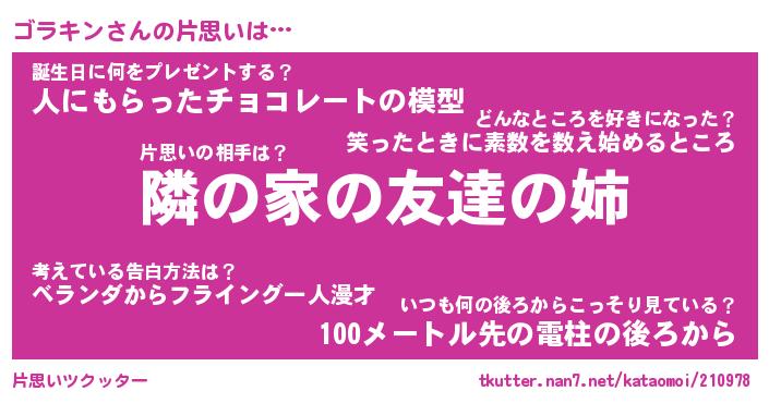 | 男性向けラノベタイトル風あだ名 | 『ゴラキンの憂鬱』 |
