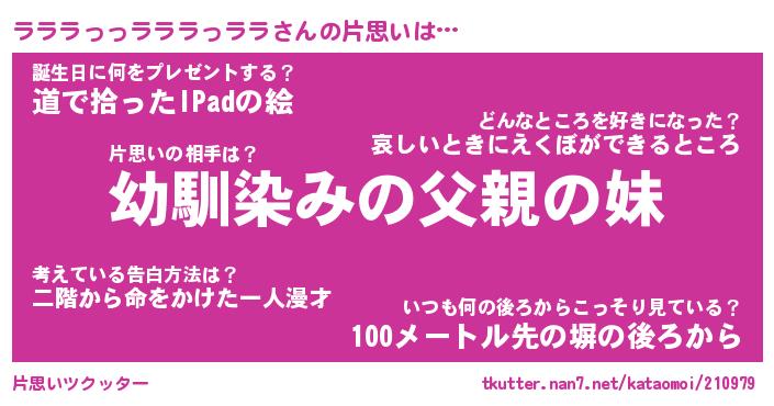 | 男性向けラノベタイトル風あだ名 | 『ラララっっラララっララの憂鬱』 |