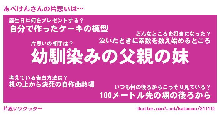 | 男性向けラノベタイトル風あだ名 | 『あべけんの憂鬱』 |