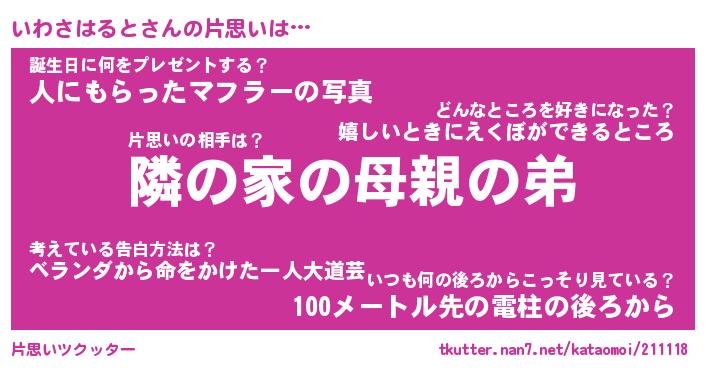 | 男性向けラノベタイトル風あだ名 | 『いわさはるとの憂鬱』 |