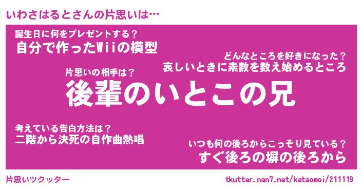 | 女子向けラノベタイトル風あだ名 | 『誰かこのいわさはるとを説明してください! ~契約から始まるウェディング~』 |