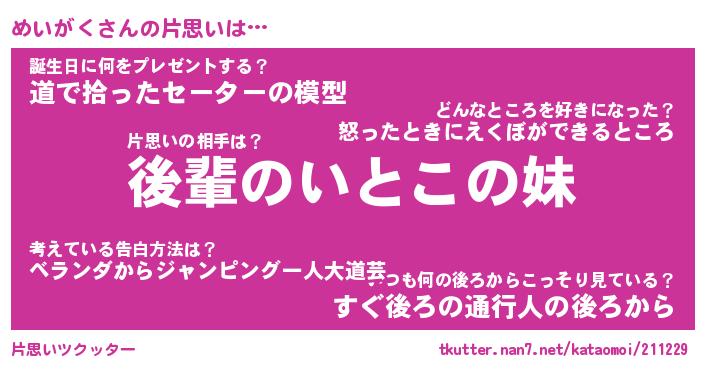 | ヘコむあだ名 | 『めいにゅー』『豆乳』『めいっぺ』 |