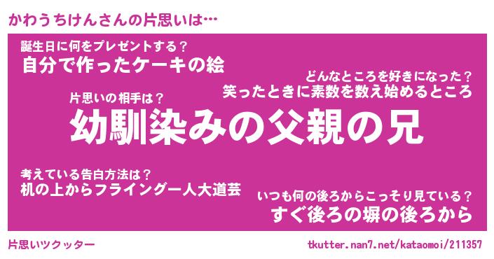 | 男性向けラノベタイトル風あだ名 | 『かわうちけんの憂鬱』 |