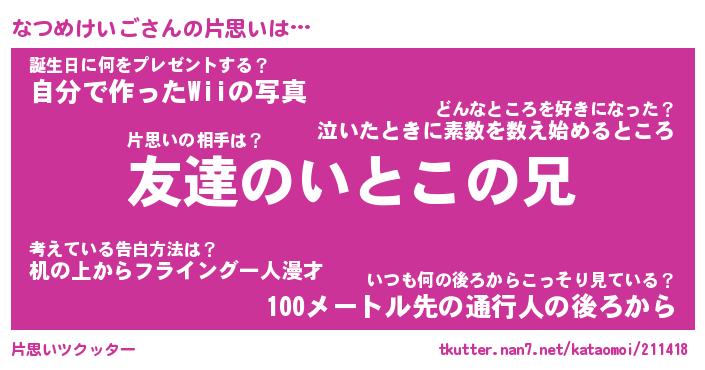 | 胡散臭い通販商品みたいなあだ名 | 『億万長者になれる水晶球…その名も「なつめけいご」』 |
