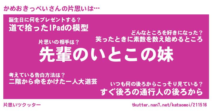 | ツイッター | かめおきっぺいさんのツイッターID『katatsumuri_idle』 |