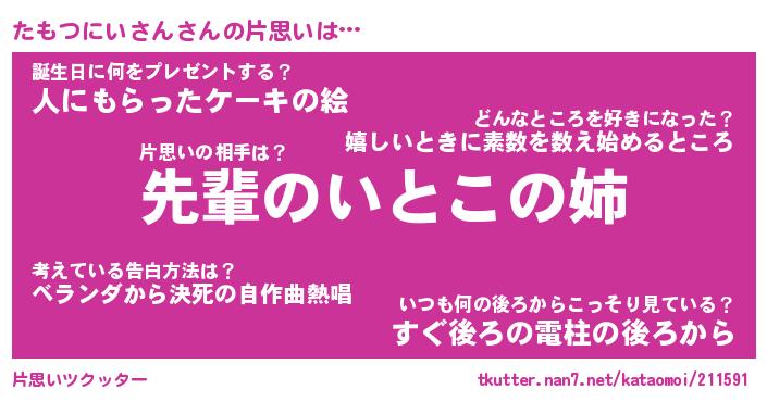 | 男性向けラノベタイトル風あだ名 | 『たもつにいさんの憂鬱』 |