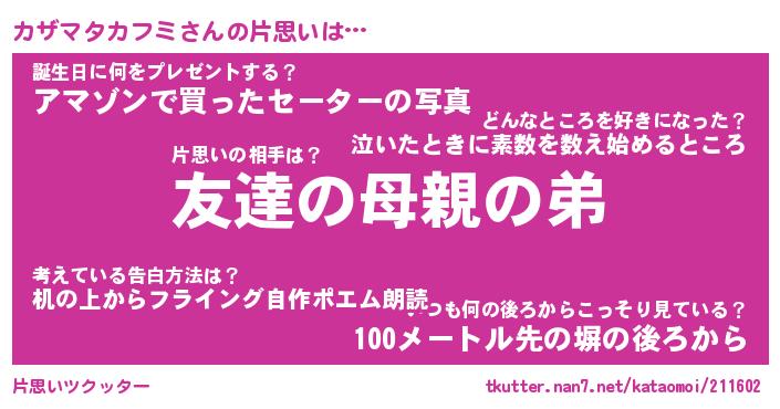 | 女子向けラノベタイトル風あだ名 | 『誰かこのカザマタカフミを説明してください! ~契約から始まるウェディング~』 |