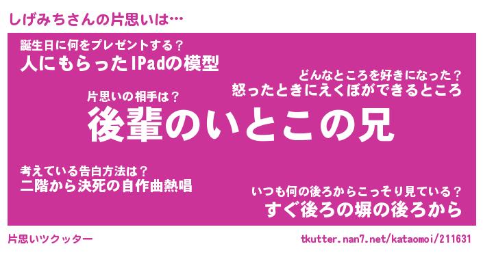 | ピコ太郎風あだ名 | 『シコ四郎』『ピシ五郎』『シゲ一郎』 |