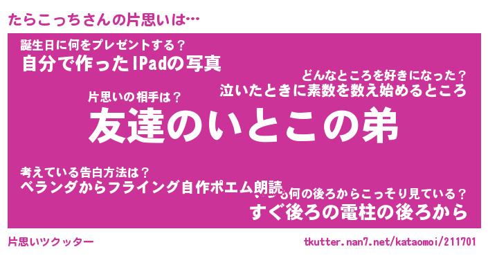 | ヘコむあだ名 | 『たらにゅー』『つくし』『たらお』 |