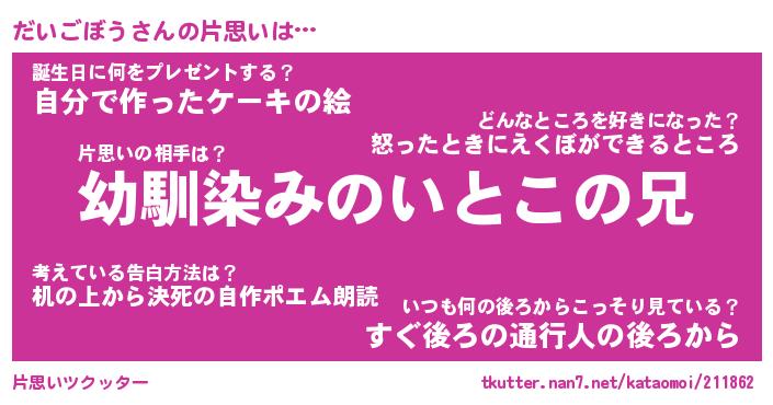 | 男性向けラノベタイトル風あだ名 | 『だいごぼうの憂鬱』 |