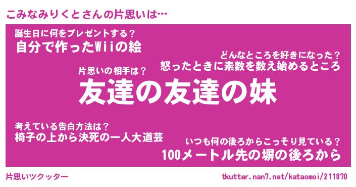 | ヘコむあだ名 | 『こみっふぃ~』『つくし』 |