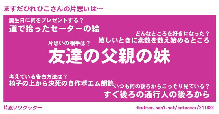 | 女子向けラノベタイトル風あだ名 | 『誰かこのますだひれひこを説明してください! ~契約から始まるウェディング~』 |