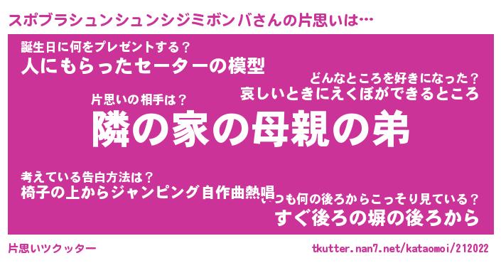 | 男性向けラノベタイトル風あだ名 | 『スポブラシュンシュンシジミボンバの憂鬱』 |
