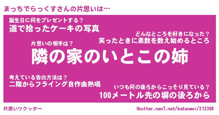 | ツイッター | まっちでらっくすさんのツイッターID『tsukushi_idle』 |