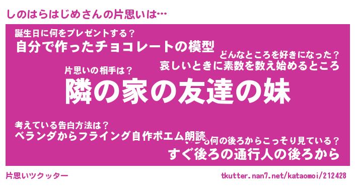| 男性向けラノベタイトル風あだ名 | 『しのはらはじめの憂鬱』 |