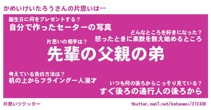 | 男性向けラノベタイトル風あだ名 | 『かめいけいたろうの憂鬱』 |