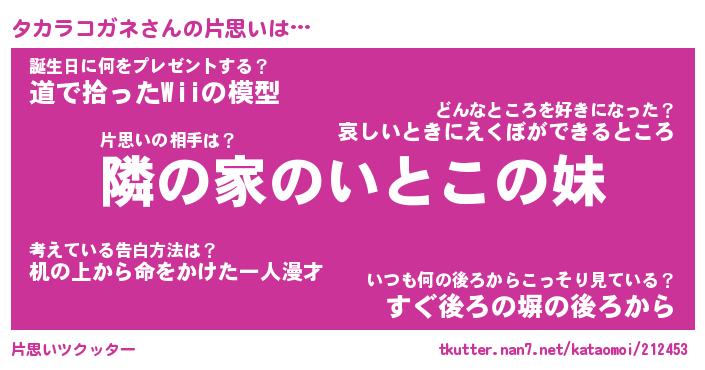 | 男性向けラノベタイトル風あだ名 | 『タカラコガネの憂鬱』 |
