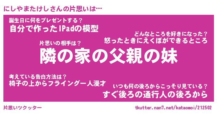 | 胡散臭い通販商品みたいなあだ名 | 『モテモテ間違いなし水晶球…その名も「にしやまたけし」』 |