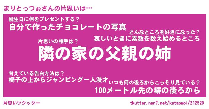 | 男性向けラノベタイトル風あだ名 | 『まりとっつぉの憂鬱』 |