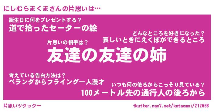 | 女子向けラノベタイトル風あだ名 | 『誰かこのにしむらまくまを説明してください! ~契約から始まるウェディング~』 |