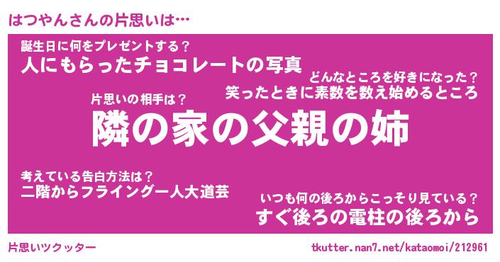 | 胡散臭い通販商品みたいなあだ名 | 『モテモテ間違いなし水晶球…その名も「はつやん」』 |