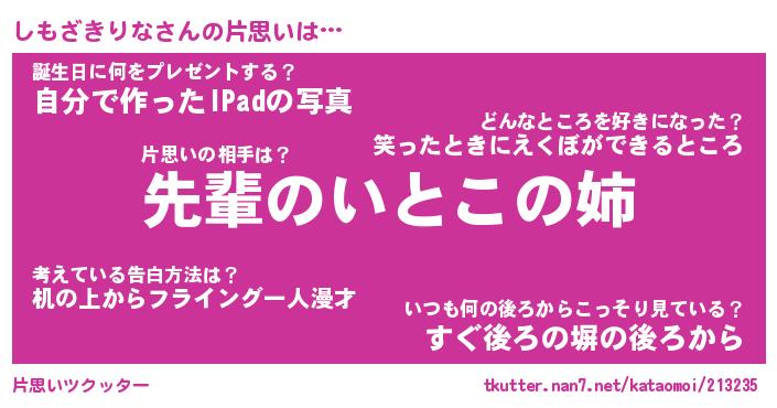 | ヘコむあだ名 | 『しももー』『つくし』『しもお』 |