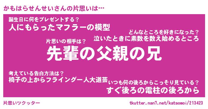 | 男性向けラノベタイトル風あだ名 | 『かもはらせんせいの憂鬱』 |