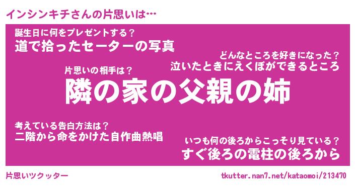 | 男性向けラノベタイトル風あだ名 | 『インシンキチの憂鬱』 |