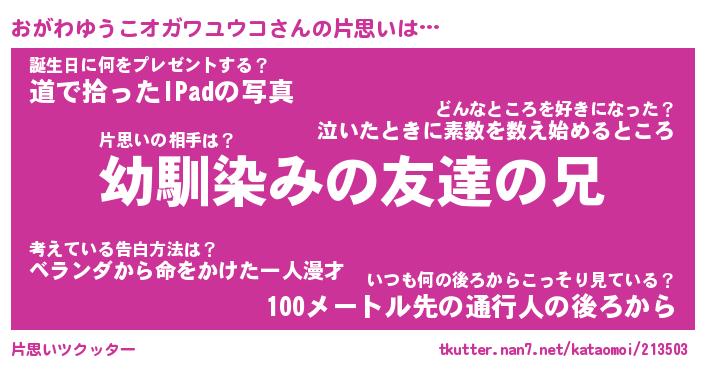 | 女子向けラノベタイトル風あだ名 | 『(仮)おがわゆうこオガワユウコのやんごとなき事情』 |
