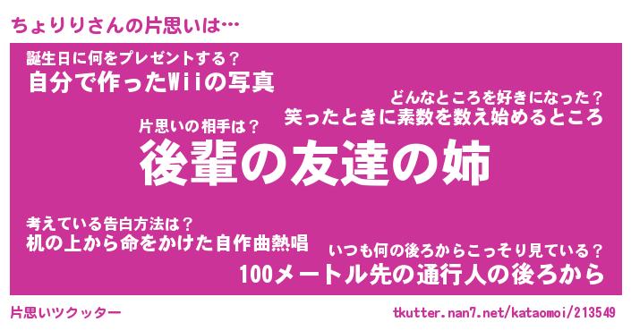 | ヘコむあだ名 | 『ちょっふぃ~』『つくし』 |