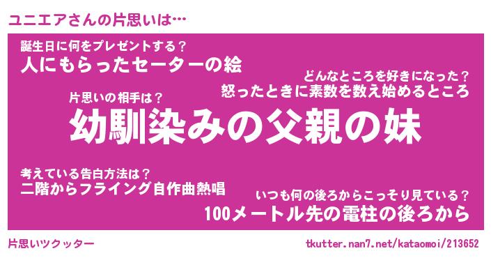 | ヘコむあだ名 | 『ユニにゅー』『酢こんぶ』『ユニを』 |