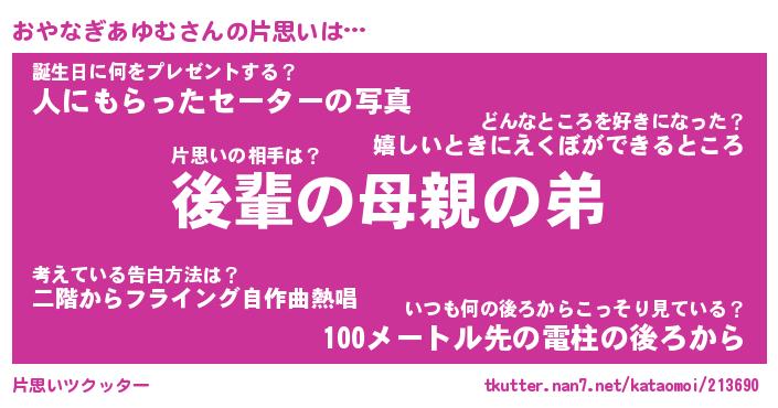 | 恥ずかしいあだ名 | 『プリティーおやなぎあゆむ』『おやちん』 |