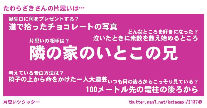 | 女子向けラノベタイトル風あだ名 | 『(仮)たわらざきのやんごとなき事情』 |