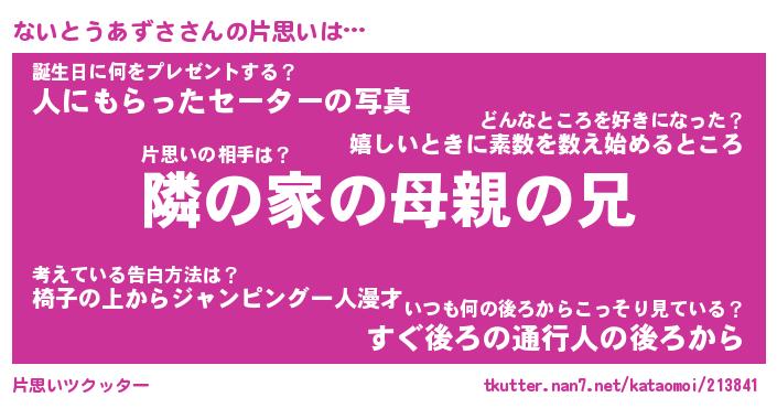 | 女子向けラノベタイトル風あだ名 | 『(仮)ないとうあずさのやんごとなき事情』 |