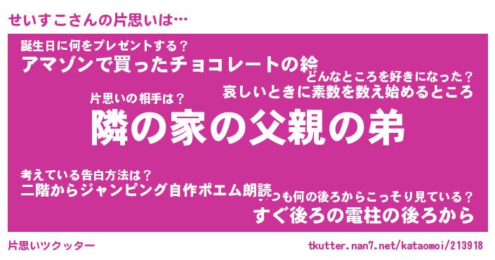 | 意味不明あだ名 | 『ペロリンせいすこ』『永久保存せいすこ』 |