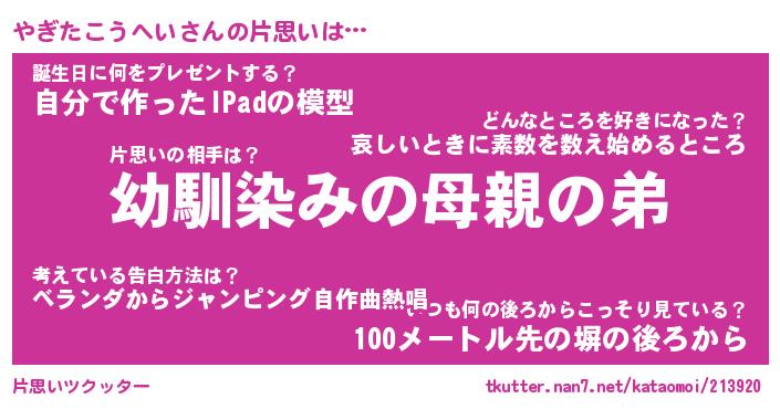 | 女子向けラノベタイトル風あだ名 | 『(仮)やぎたこうへいのやんごとなき事情』 |