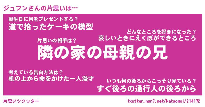 | ヘコむあだ名 | 『ジュふぇ~』『豆乳』『ジュっちょ』 |