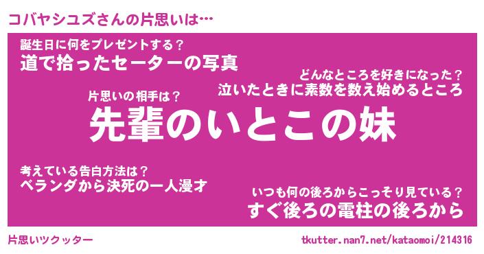 | ヘコむあだ名 | 『コバもー』『つくし』『コバっぺ』 |