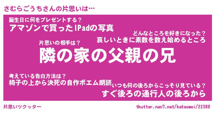 | 男性向けラノベタイトル風あだ名 | 『さむらごうちの憂鬱』 |