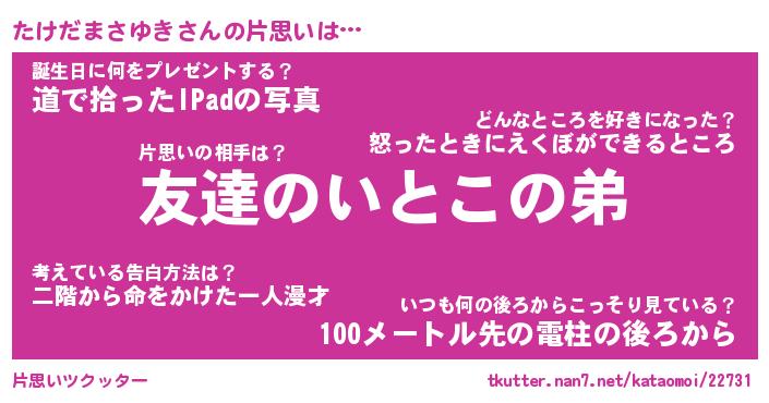 | ヘコむあだ名 | 『たけもー』『豆乳』『たけ太郎』 |