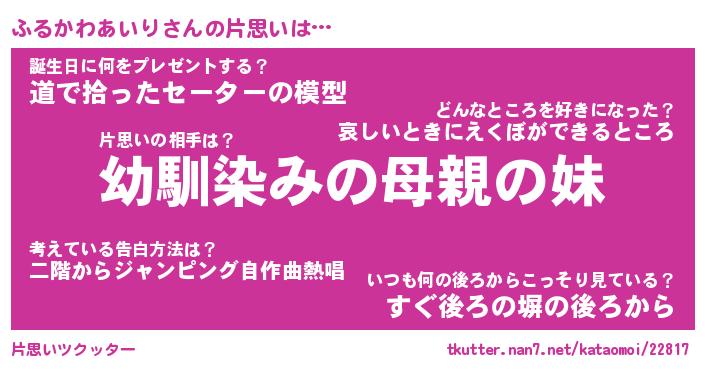| 胡散臭い通販商品みたいなあだ名 | 『必ず成功するブレスレット…その名も「ふるかわあいり」』 |