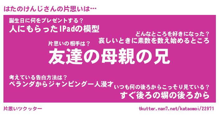 | 女子向けラノベタイトル風あだ名 | 『誰かこのはたのけんじを説明してください! ~契約から始まるウェディング~』 |