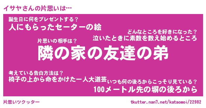 | 意味不明あだ名 | 『ペロリンイサヤ』『イサヤフォーエバー』 |
