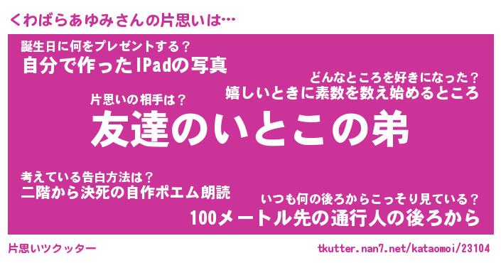 | 伝説のあだ名 | 『封印されしスナイパーくわばらあゆみ』 |