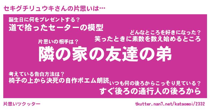 | 男性向けラノベタイトル風あだ名 | 『セキグチリュウキの憂鬱』 |