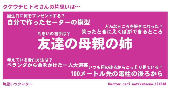 | 胡散臭い通販商品みたいなあだ名 | 『億万長者になれるブレスレット…その名も「タケウチヒトミ」』 |