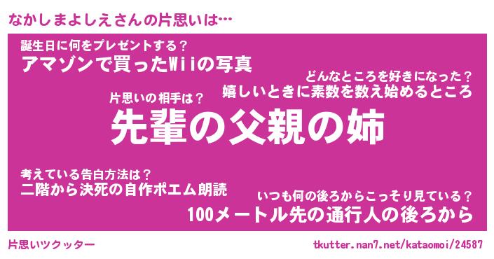 | 男性向けラノベタイトル風あだ名 | 『なかしまよしえの憂鬱』 |